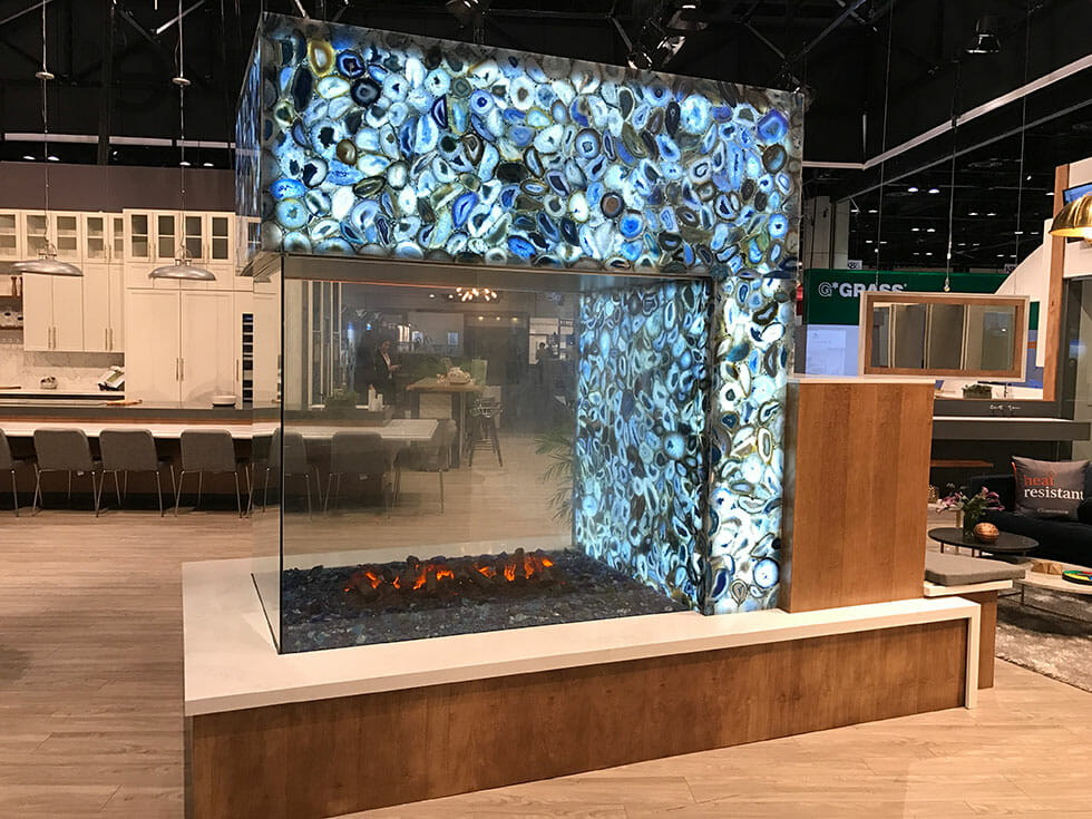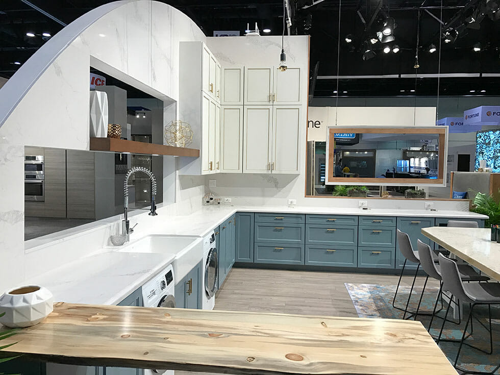 Our coffee bar was buzzing all day long; thousands of guests were able to picture Georgian Bluffs in their own home as they prepared their perfect Americano. We paired this beautiful grey with dark blue cabinetry & live edge Colorado pine.
