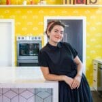 Bennett handpicked Caesarstone’s polished 5143 White Attica, a brilliant white surface with rich black veining. To add even more eye-popping effect, she adorned the walls with a bright sunshine-yellow Clare V wallpaper, resulting in an inviting, elegant yet eclectic feel that welcomes in guests and fellow chefs.
