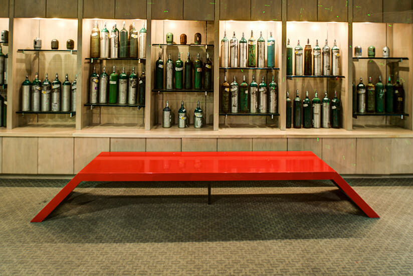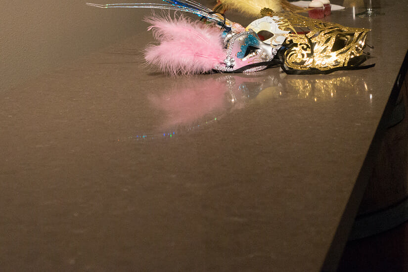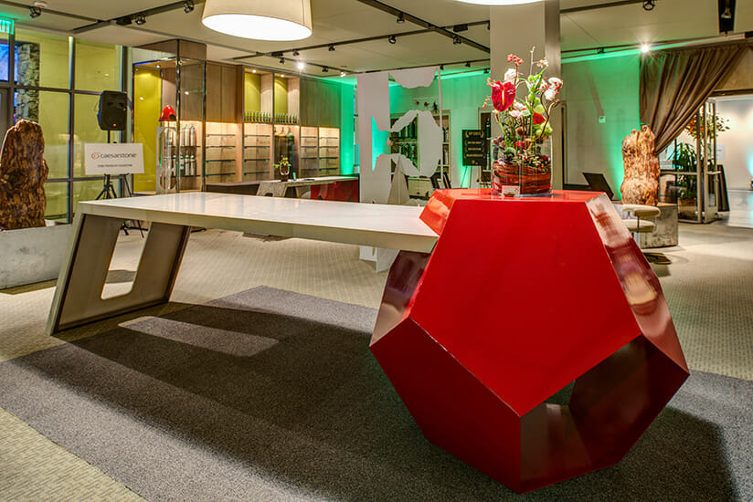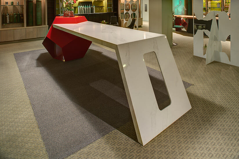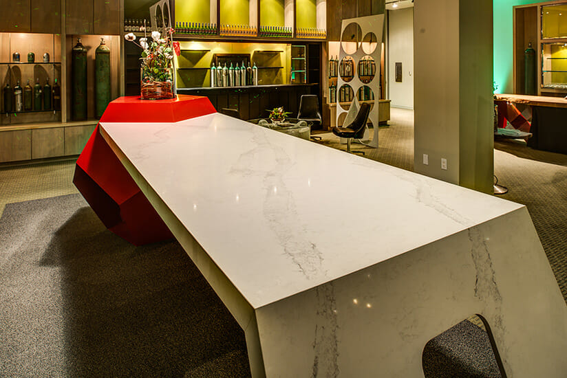The Ice Bar and Geo Bar were made of Calacatta Nuvo tops, Caesarstone’s interpretation of Calacatta, which launched in October 2014. The Cooks Tables were made of Coastal Grey, one of eight new colors launching in January 2015 and Red Shimmer bench all designed by Richard Vonsaal -Vonsaal Design Build.