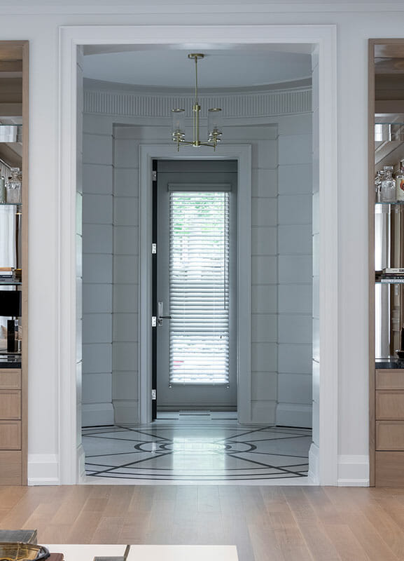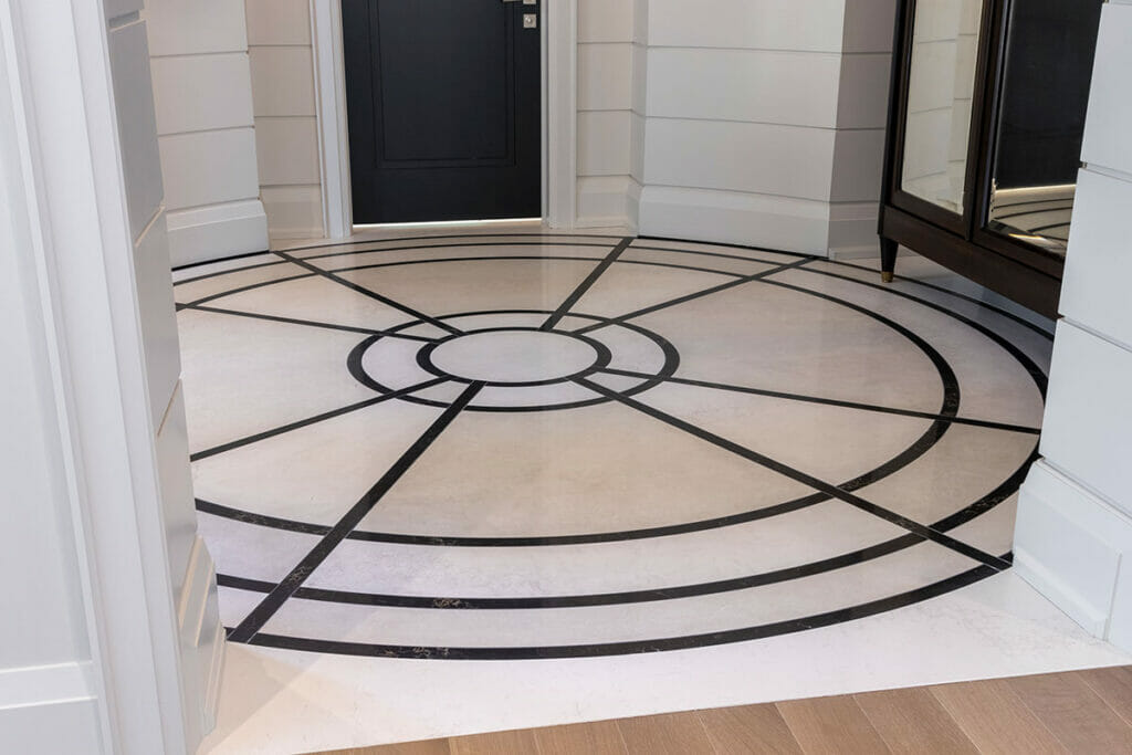 Starting in the showstopping foyer, Gluckstein used 5131 Calacatta Nuvo, 5100 Vanilla Noir, and 5130 Cosmopolitan White to create an entryway with serious presence. The intricate, graphic flooring design mirrors the large, curved bay windows of the home.