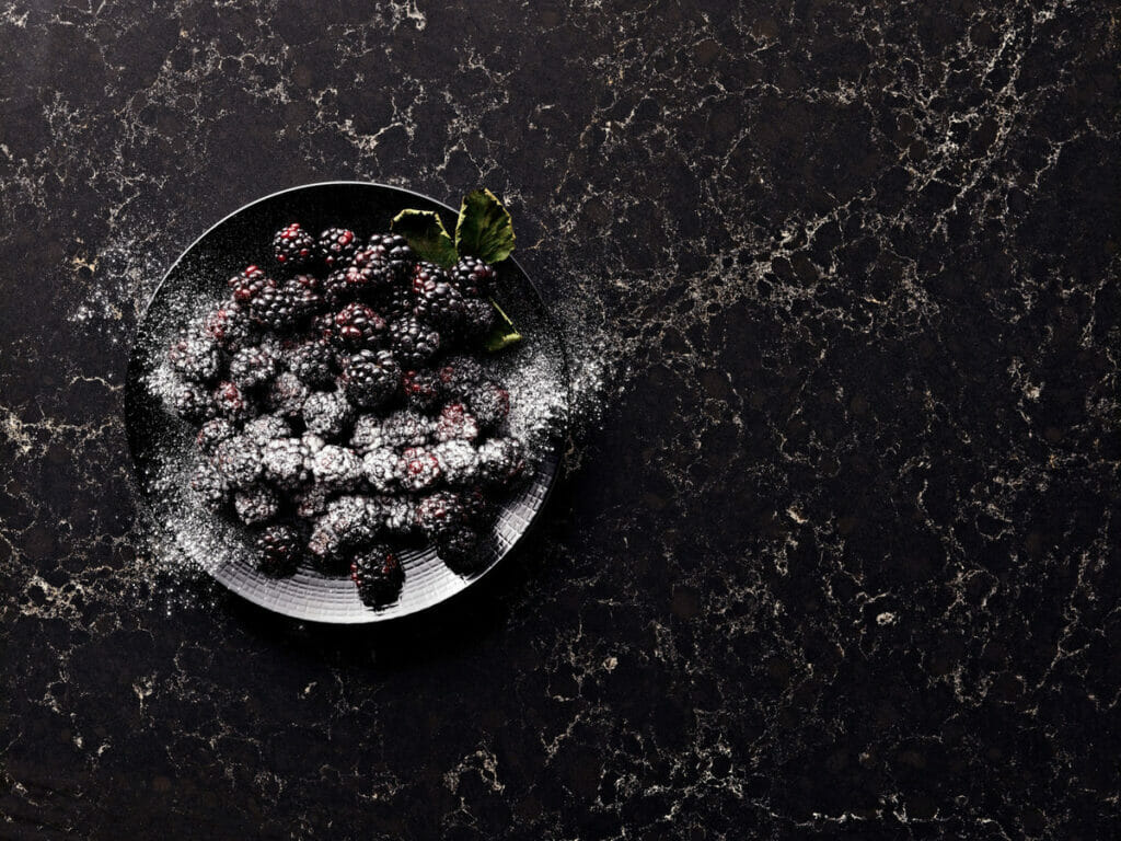 Homeowners who are looking to add navy blue decorations into their kitchen should look for an equally deep, dark type of quartz, such as Caesarstone’s 5820 Darcrest.