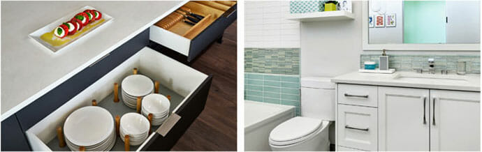 The boy’s and girl’s bathrooms are similar, yet unique to the children who will enjoy them. Both made special with different pops of tile color and 4141 Misty Carrera countertops.