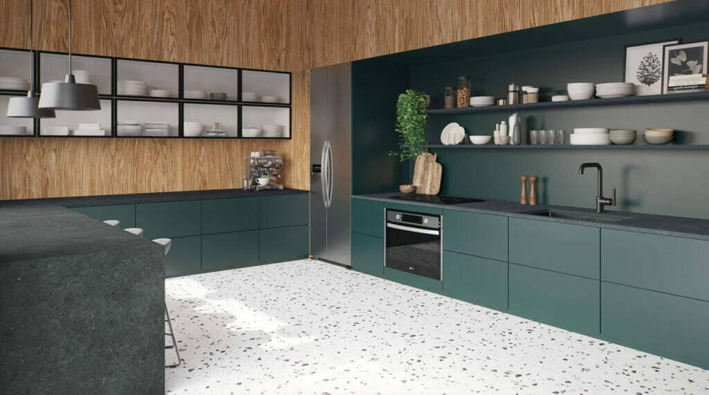 Dark porcelain, like Caesarstone’s 220 Magnate, can be an excellent choice for creating a deep, dramatic-looking space or for providing contrast with lighter interior elements. Regardless, dark porcelain is an exquisite addition to any home.