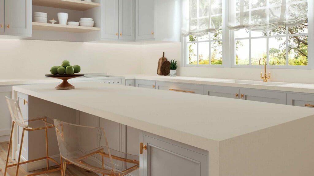 In addition, light color quartz serves as a clean canvas, making decorating and accessorizing easy. To bring out the translucence of quartz, under cabinet lighting can be used, or to showcase the pure beauty of quartz, coordinated platters can be displayed.