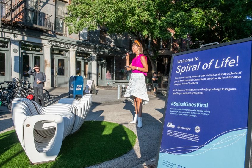 In collaboration with NYCxDesign, Caesarstone has brought an artist’s inspiration to reality. The Spiral of Life design by Kickie Chudikova was celebrated on September 15 with the New York design community, NYC’s Department of Transportation’s Art Program, Dumbo Improvement District, and Design Trust for Public Space. Gail Conroy, VP of Marketing, US, attended the event to represent Caesarstone for this exciting unveiling.
