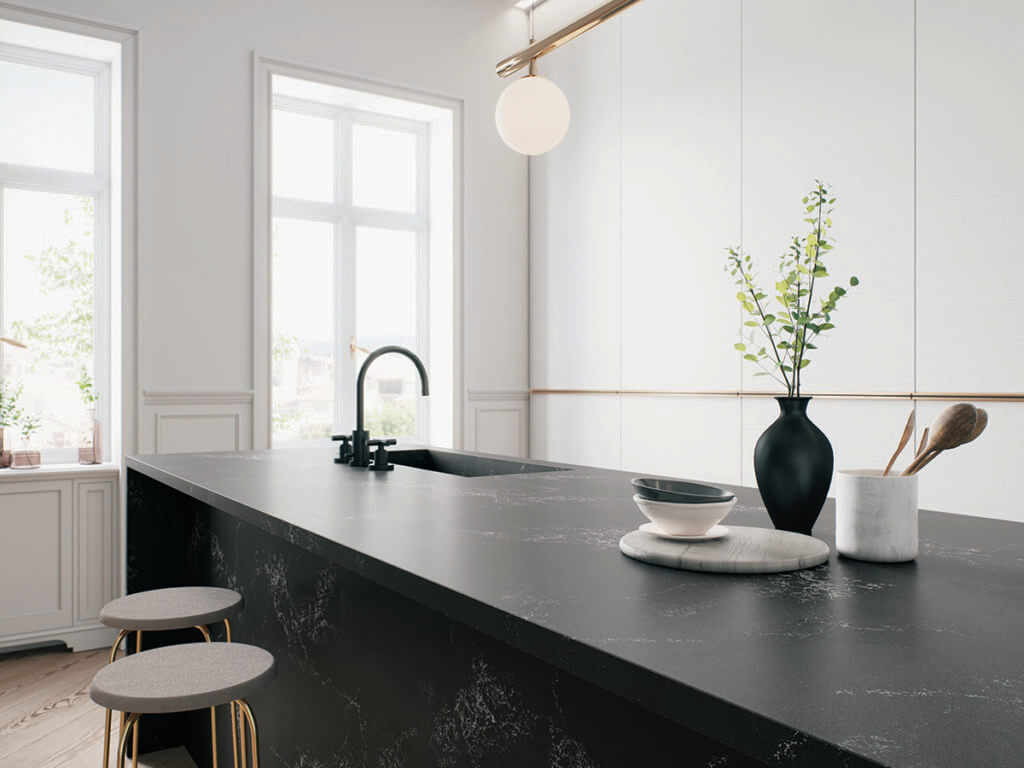 A fresh white kitchen looks great, but it looks even better when complemented by a black quartz countertop, like Caesarstone’s 3100 Jet Black or 5820 Darcrest. The deep, bold colors of these countertops adds a striking contrast to white kitchen spaces.
