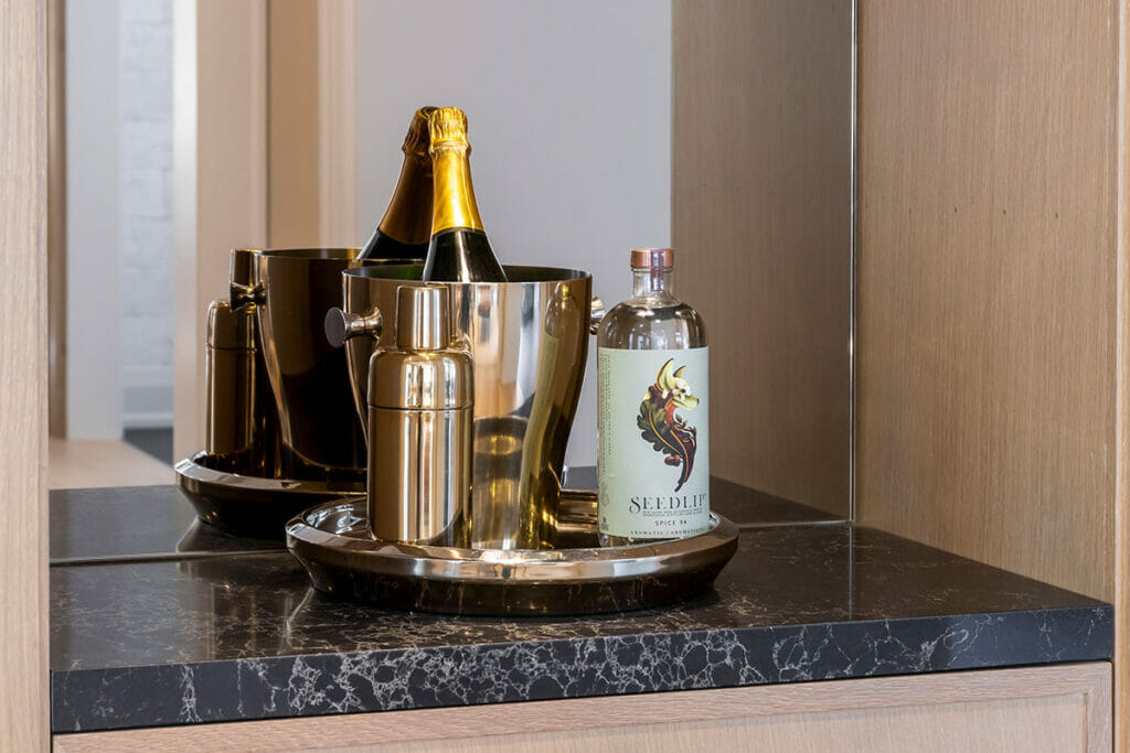 Some eye-catching, premium examples of patterned black and white quartz are Caesarstone’s 5171 Arabetto or 5100 Vanilla Noir. Both products have their own unique qualities that add a sense of personality and character to an in-house bar.