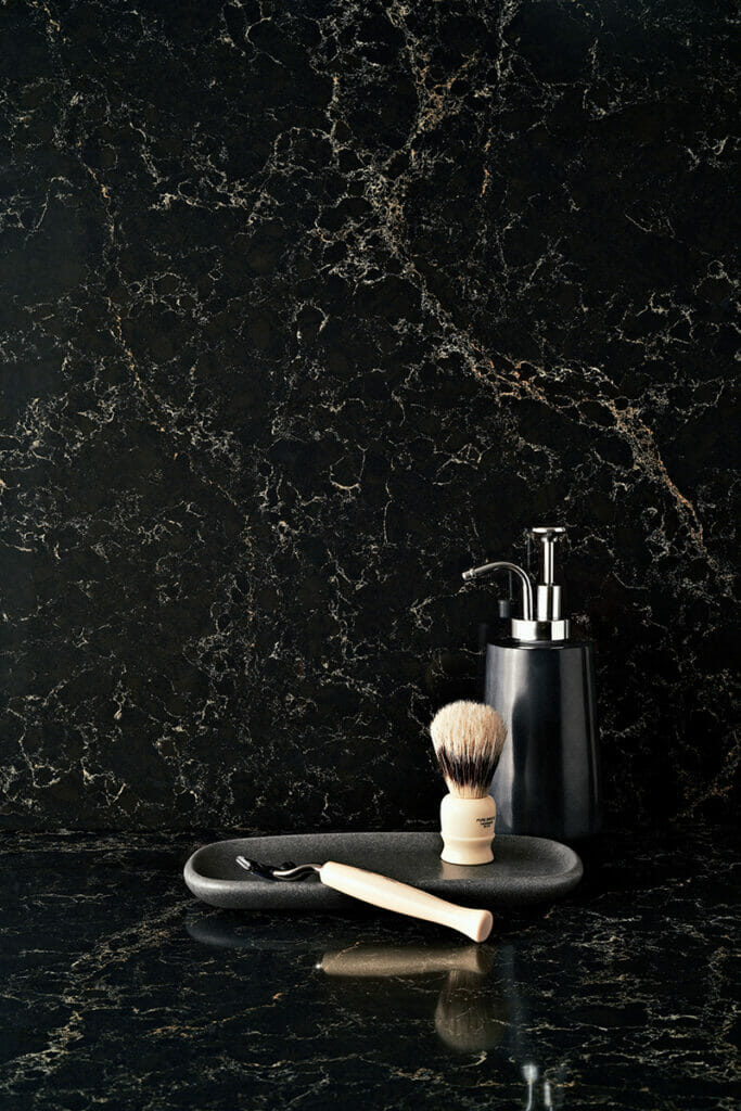 When visitors come into the bathroom, they will be instantly drawn to the countertops, making them the space’s focal point. Homeowners can pair classic black quartz counter surfaces, like Caesarstone’s 3100 Jet Black or 4120 Raven, with an array of gray and white bathroom decor pieces. Some examples of popular bathroom decor include: