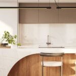 The classic-style structure of the cabinets blends in perfect harmony with the exposed wood of the island...
