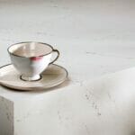 A misty white base that unravels with the softest strokes of earthy veining, swirling slowly into the stone that radiates a translucent glow, with warm, milky movements.