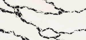 A bright white backdrop richly textured with a juxtaposition of bold oversized black veins, meandering in a granular stream of dark minerals and brownish deposits that shift, burst, and rupture with an organic tempo.