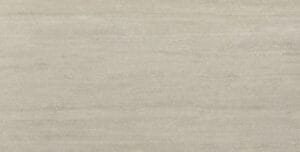 Misty clays create a two-toned earthy base banded with silver greys, creating the dense linear appearance of ancient travertine, enhanced by tiny oxidized puddles. Metallic accents, layers of fine alloy stratum, and creamy streaks blend into the neutral palette, giving it an airy appearance, in Stone finish.