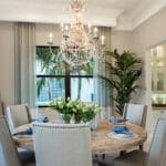 Crystal chandeliers and elaborately carved woodwork create the traditional space’s stately atmosphere, decorated with large, lavish, and comfort-inspiring elements, glass-fronted display cabinets, and stylized cornices that highlight walls with the ceiling.